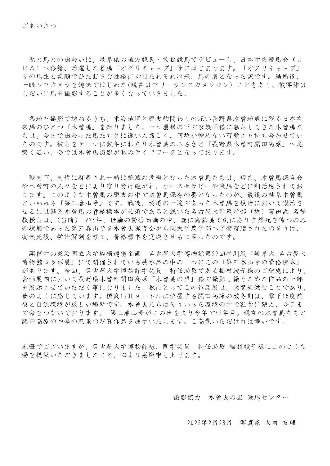 木曽馬の今を伝える写真家・大岩友理さんに、木曽馬の写真展を特別展「岐阜大・名古屋大 博物館コラボ展」の会場スペースにて開催いただきました。
