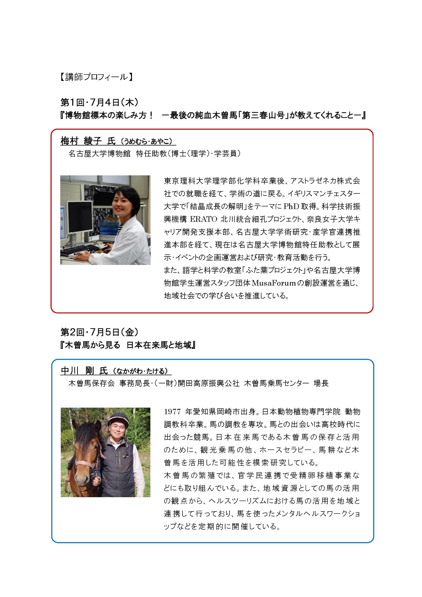 全2回の講演会です。名古屋大学博物館からは、『博物館標本の楽しみ方!-最後の純血木曽馬「第三春山号」が教えてくれること-』をタイトルにしてお話します。