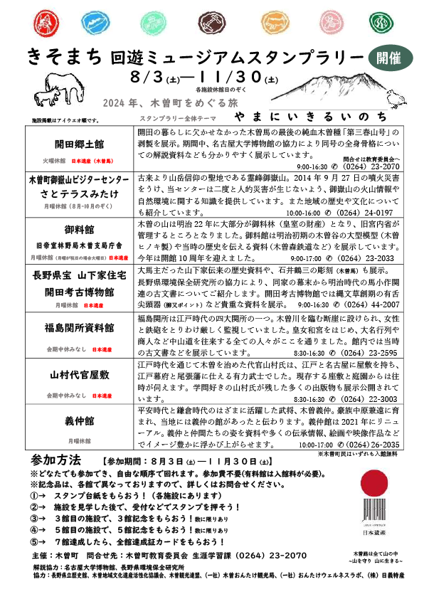 In Kiso Town, Nagano Prefecture, a "Kisomachi Circuit Museum Stamp Rally" has been held from August 3rd to November 30th, 2024, as a journey around Kiso Town.